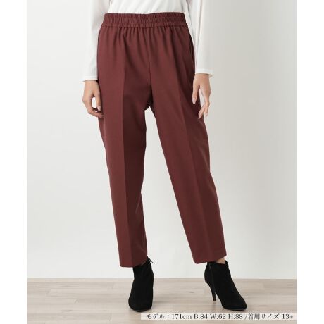伸縮性のある素材で仕立てた、快適な履き心地のパンツです。ウエストゴム仕様でリラックス感がありながらも、きれいなシルエットが上品な印象。秋のコーディネートに活躍する一枚です。