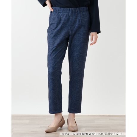 暖かな着心地と美しいシルエットを両立する、冬に嬉しいスリムパンツ。機能的なポリエステル混素材にポリウレタンを混紡することで、快適なストレッチ性を実現いたしました。上品なチェック柄が、コーディネートに洗練されたアクセントを添えます。ご自宅で手洗いできるウォッシャブル仕様で、お手入れも簡単。ウエストはゴム入りで、窮屈感なく快適にお召しいただけます。フィット感がありながらも、体を締め付けすぎない絶妙なサイズ感で、脚のラインをすっきりと見せてくれます。大人の女性の多様なライフスタイルに寄り添う、機能性とデザイン性を兼ね備えた一本です。