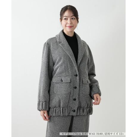 千鳥格子柄がクラシックで上品なジャケットです。襟付きのデザインがきちんとした印象を与えつつ、裾と袖口にあしらわれたシャーリングが、柔らかなシルエットと女性らしい雰囲気をプラスしています。フロントボタンで開閉でき、両胸のフラップポケットもデザインのアクセントになっています。厚手の素材感は、肌寒い季節の羽織りとして活躍し、同素材のボトムスと合わせれば、洗練されたセットアップスタイルが楽しめます。
