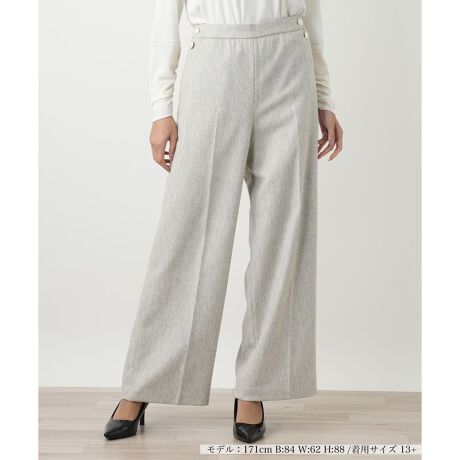 快適な穿き心地と美しいシルエットを両立する、ワイドパンツ。上質な毛を主体とした素材にポリエステル、ナイロン、レーヨン、ポリウレタンをブレンドすることで、程よいストレッチ性を実現いたしました。ゆったりとしたワイドシルエットは、脚のラインを拾いすぎず、優雅な動きを演出。ウエストはゴム入りで、窮屈感なく快適にお召しいただけます。無地ライクなデザインなので、様々なトップスと合わせやすく、着回し力も抜群です。オフィスシーンはもちろん、普段使いまで、幅広いシーンで活躍する汎用性の高い一本です。