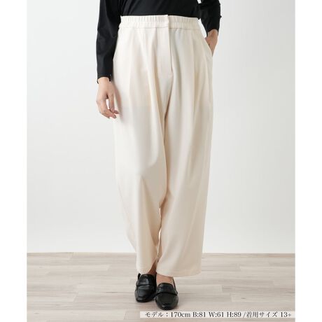 伸縮性のある素材で仕立てた、快適な履き心地のパンツです。ウエストゴム仕様でリラックス感がありながらも、きれいなシルエットが上品な印象。秋のコーディネートに活躍する一枚です。