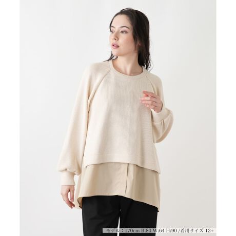 ニットと布帛の異素材を組み合わせた、レイヤードデザインのプルオーバーです。深みのあるニット素材は、表面感のある編みがカジュアルな印象を与えつつ、立体的な表情を生み出します。裾から覗くシャツのような布帛素材が、シンプルなデザインに奥行きと軽やかさをプラス。ゆったりとした身幅とドロップショルダー、そして袖口にギャザーを寄せたデザインが、リラックス感のある着心地と女性らしいシルエットを両立させます。一枚でコーディネートが完成する、デザイン性の高いアイテムです。