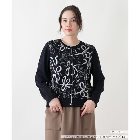 クラシカルなクルーネックに、リボンとフラワーモチーフの柄が華やかな印象を与えるカーディガンです。緻密に編み込まれた柄は、立体感があり、上品な雰囲気。襟元と前立てのパイピングがデザインを引き締め、アクセントになっています。パール調のボタンが、さらにエレガントさをプラス。薄手のニット素材は、季節の変わり目の羽織りとして最適で、ワンピースやスカートスタイルに合わせれば、フェミニンな装いを完成させます。シンプルなボトムスと合わせるだけで、着映えする一枚です。