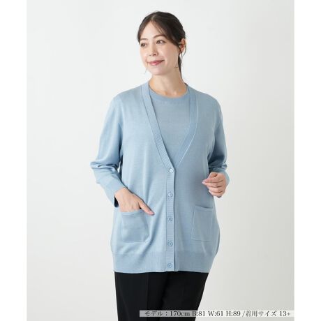 イタリアの光沢糸と毛をブレンドし、高度なプレーティング編みで丁寧に仕立てたカーディガン。光沢糸を表面に、毛を裏面に配することで、適度な光沢感とハリ感が特徴です。すっきりとしたノーカラーのVネックデザインが、どんなインナーにも合わせやすく、上品な装いへ導きます。軽く羽織るだけで、洗練されたスタイルをお楽しみいただけます。