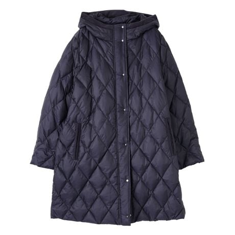 全体に施されたダイヤモンドキルティングが、装いに奥行きと立体感を加えます。フードデザインが顔まわりに柔らかな印象を与え、カジュアルながらも上品な佇まいを演出します。フロントの光沢のあるスナップボタンは、開閉のしやすさとデザインのアクセントを両立しています。ふっくらとしたミドル丈のシルエットは、身体を優しく包み込み、心地よい着心地を叶える一着です。両サイドのポケットも実用性を兼ね備えています。