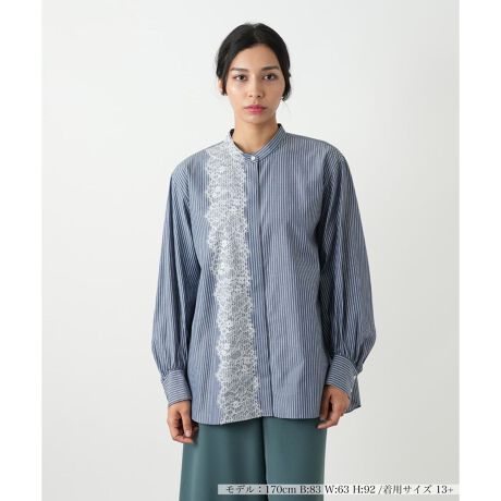洗練されたストライプ柄が魅力の、スタンドカラーシャツブラウス。コットン100%の柔らかな肌触りが心地よく、日常に溶け込む快適な着心地です。襟元や前立てに施された繊細なレース使いが、上品な透け感とフェミニンな印象をプラス。長袖と品の良いスタンドカラーが、洗練された大人の女性の品格を演出いたします。ご自宅で手洗いできるウォッシャブル仕様で、日常のお手入れも簡単。一枚で着ても華やかな存在感を放ち、ジャケットやカーディガンのインナーとしても上品に映えます。秋の通勤スタイルから、ちょっとしたお集まりまで、幅広いシーンで活躍する一枚です。