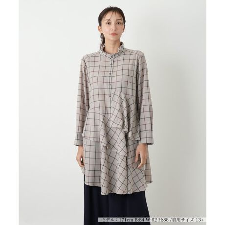 秋らしいチェック柄が目を引く、スタンドカラーブラウス。ポリエステルとレーヨンをブレンドした素材は、柔らかな肌触りと適度なハリ感を兼ね備えています。チェック生地をアシンメトリーに配したデザインが、モダンで洗練された印象を与えます。スタンドカラーと長袖のデザインが、大人の女性の品格を一層引き立てます。ご自宅で手洗いできるウォッシャブル仕様で、日常のお手入れも簡単。一枚で着ても華やかな存在感を放ち、ジャケットやカーディガンのインナーとしても上品に映えます。秋のコーディネートに上品さと個性を添える、着回し力の高い一枚です。