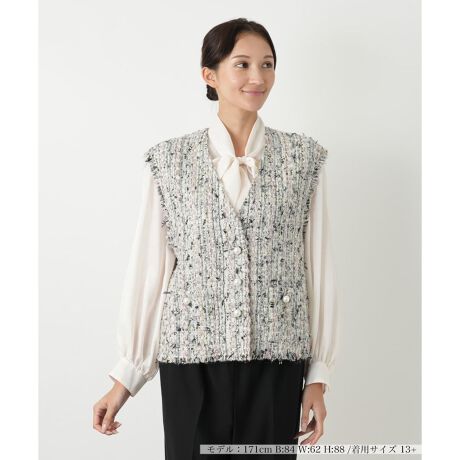 表情豊かなミックスツイード素材が魅力のVネックベストです。CLARENSONの上質な素材が、コーディネートに洗練された表情を与えます。襟ぐりや裾、アームホールにあしらわれたフリンジが、デザインに軽やかな動きとニュアンスをプラス。フロントに並んだパール調のボタンが、上品で華やかなアクセントになっています。一枚羽織るだけで、秋の装いがぐっと格上げされ、様々なトップスとのレイヤードスタイルが楽しめます。