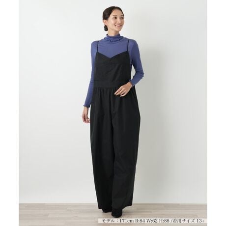 細い肩紐と、胸元のV字の切り替えが特徴的なサロペットパンツです。マットな質感の素材が、カジュアルすぎず上品な印象を与えます。ウエスト部分にはゴムが入っており、リラックスした着心地でありながら、ゆったりとしたワイドシルエットがトレンド感を演出。体型をカバーしつつ、女性らしい柔らかな雰囲気をプラスします。インナー次第で様々な表情が楽しめる、着回し力の高い一枚です。