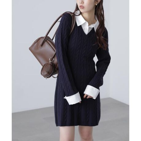 今季トレンドのテニスコアを意識したシャツレイヤード風デザインのワンピース。身頃部分はニット、袖と衿は布帛のシャツ生地をドッキングしています。しっかりした肉感で、1枚でも安心して着ていただけます。細いケーブル編みで縦ラインを強調したり、ウエストが自然と絞られたデザインで、スタイルアップを期待。襟はボタンを1つ開けて着こなすのがおすすめ。ニットの袖口リブに沿ってカフスを折り返したり、カフスのボタンを1つ開けても着用いただけます。※モデルの着用画像の場合、光の当たり具合により、実際の色味と異なって見えることがございます。色味は、商品単体の画像をご参照ください。