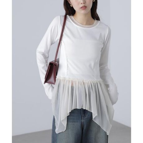 チュールとフライスカットソーをレイヤードしたようなデザイントップス。襟まわりはレイヤード風にして、チュールの裾はギャザーを寄せたイレギュラーヘムで動きのあるデザインに。タイトなシルエットながらも、裾でふんわり揺れるチュールがかわいいです。身頃のパネルハギには、小ぶりのレースを挟み込んだこだわりのディテールに。伸縮性のある素材なので着心地もよいです。レイヤード風デザインのため、デニムと合わせるだけでスタイリングが決まります。上からニットを重ねて裾からチュールを見せる着こなしも楽しめます。※モデルの着用画像の場合、光の当たり具合により、実際の色味と異なって見えることがございます。色味は、商品単体の画像をご参照ください。