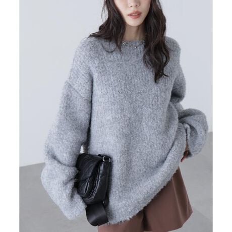昨シーズンご好評いただいたニットが、新色グレーとブルーを加えて登場!ふんわり感がかわいいメランジ調ブークレー糸にラメ糸をひき揃え、さりげないシャイニー感を出したミドル丈の畦ニット。首元が広く開くので、顔まわりをすっきりと見せてくれます。ドロップショルダーのゆったりとしたサイズ感と柔らかい肌触りがポイント。リラクシーな雰囲気でオフショルダーやワンショルライクにも着こなせます。ショートパンツやナロースカート合わせがおすすめです。※モデルの着用画像の場合、光の当たり具合により、実際の色味と異なって見えることがございます。色味は、商品単体の画像をご参照ください。