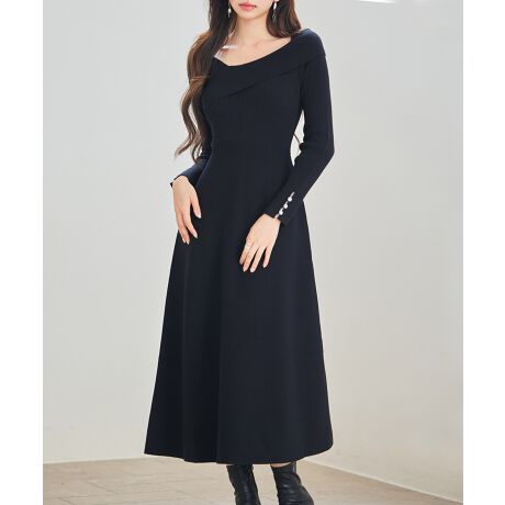 アシンメトリネック長袖ミディ丈ニットワンピース