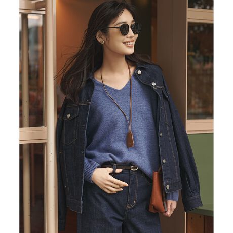 首元をすっきりと見せる、トリムレスなVネックプルオーバー。シンプルなシルエットながらも、さりげない前振りの切り替えと、存在感のある太めの袖リブがデザインのアクセントになっています。一枚でさらりと着ていただくのはもちろん、中にTシャツやブラウスをレイヤードして、こなれ感のあるスタイリングを楽しむのもおすすめです。オフィスシーンではきれいめパンツと合わせて上品に、休日はデニムやフレアスカートと合わせてカジュアルダウンするなど、幅広いシーンで活躍し、大人の女性らしい抜け感を演出します。カラーは、クリーンで洗練された印象のホワイト(#001)、どんな色とも相性が良いライトグレー(#003)、着こなしに深みを与えるグレー(#004)、華やかで女性らしいマゼンタ(#014)、優しく柔らかな印象のベージュ(#033)、知的で洗練された雰囲気のピーコックグリーン(#061)、爽やかで明るい印象を与えるライトグリーン(#062)の7色展開に加えて、さらに見上愛さんとのコラボカラーとして新たに2色が仲間入り。華やかさと洗練された雰囲気を兼ね備えたパープル(#080)と、こなれ感を演出するブルーグレー(#074)が、秋冬のワードローブに欲しい、装いのアクセントカラーとして活躍します。
