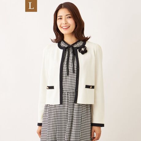 無地配色使いのクルーネックショート丈ニット羽織り。襟元には、無地タイプ限定でリボンコサージュが付属しており、さりげない華やかさを添えています。