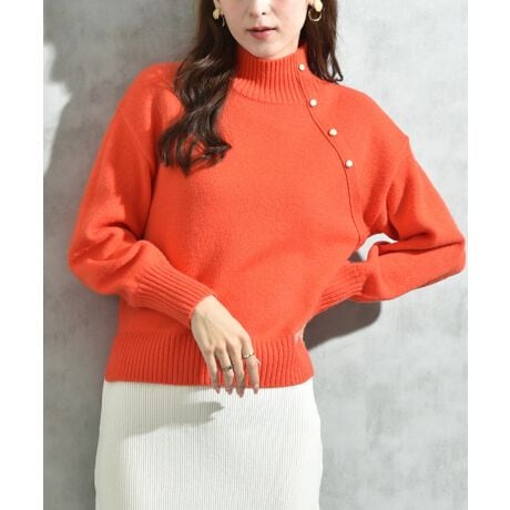 ニット特有のチクチク感もなく、やわらかい肌触りで着心地が良いのがポイントです。控えめなハイネックは顔回りをきれいに見せてくれ、ゴールドボタンでアクセントをプラスしました。