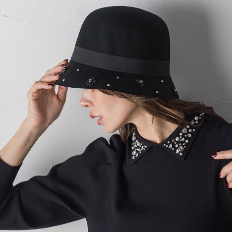 つば部分に散りばめられた小花とビジューが上品に輝き、シンプルな装いにアクセントをプラスします。