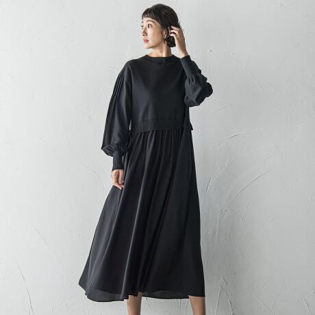 ニットと布帛をドッキングさせた異素材ミックスのワンピース。
