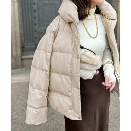 襟元にボリュームをもたせ、小顔効果のあるシルエットショート丈ダウン。
