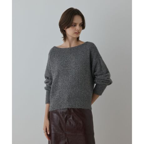 毛足の長い上質なフェザーヤーンでお作りしたニットトップス。繊細なグリッターがきらりと煌めき、装いを華やかに印象付けます。程よいハリ感と落ち感がありつつ非常に柔らかな肌あたりで、大人にも優しい着心地の良いニットに仕上げました。やや横に広い女性らしいボートネックに素材を引き立てるシンプルなデザインが、どんな装いにもスマートに馴染むポイント。身幅に余裕をもたせたゆったりとしたドルマンシルエットで、大人のカジュアルスタイルに品よく溶け込む一品に仕上げました。力の抜けた女性らしいエフォートレスな着こなしを楽しめる一着です。