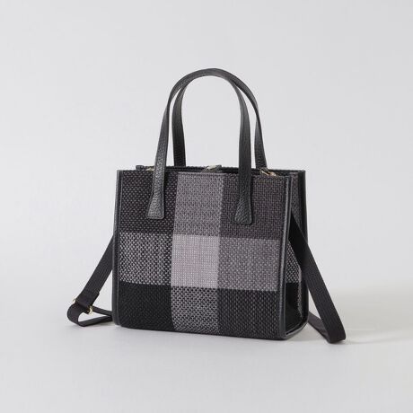 [型番:55187632__]◆クレストブリッジチェック柄のスクエアトートバッグクレストブリッジチェックツイード素材をベースに、革のトリミングとハンドルで仕上げた上品なデザインのミニトートバッグです。スマートフォンや長財布もすっきりと収まるスクエアシルエットで、デザイン性と機能性を両立させたアイテムです。付け外しのできるテープショルダーが付いており、ショルダーバッグとしても使える2WAY仕様のバッグです。