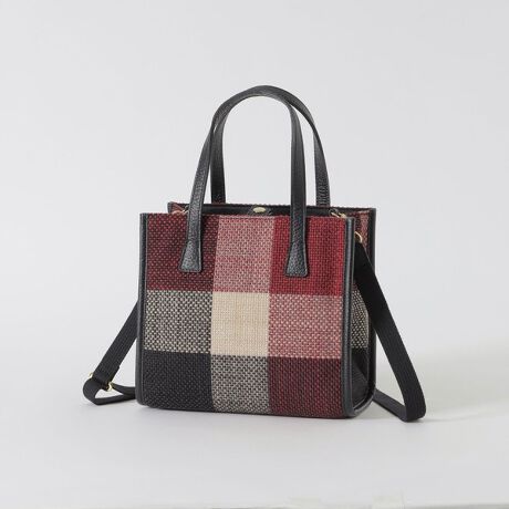 [型番:55187632__]◆クレストブリッジチェック柄のスクエアトートバッグクレストブリッジチェックツイード素材をベースに、革のトリミングとハンドルで仕上げた上品なデザインのミニトートバッグです。スマートフォンや長財布もすっきりと収まるスクエアシルエットで、デザイン性と機能性を両立させたアイテムです。付け外しのできるテープショルダーが付いており、ショルダーバッグとしても使える2WAY仕様のバッグです。