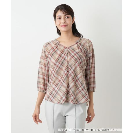 落ち着いた色合いのチェックが、大人のカジュアルスタイルに上品さを添えるブラウス。ゆったりとしたフレアシルエットが、気になるボディラインをカバーしつつ、リラックス感のある着心地を実現します。手首でフィットする七分袖は女性らしい華奢な印象を与え、アクセサリーとの相性も抜群。やや透け感のある生地が、重くなりがちな秋のコーディネートに軽やかさをプラスします。デニムやチノパンツと合わせてカジュアルに、きれいめのボトムスと合わせてオフィスルックにと、幅広いシーンで活躍。ご自宅で手洗いできる手軽さもポイントです。