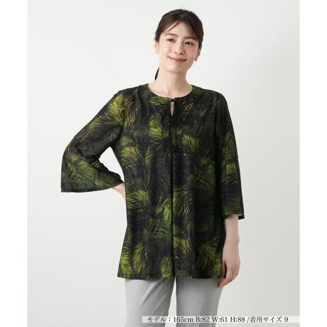 リーフモチーフがベースカラーに映え、着る人をドラマティックに彩るブラウス。薄手で軽やかな生地は、透け感があることで程よい抜け感を演出し、涼やかな着心地をキープ。ゆったりとしたフレアシルエットが、気になるボディラインを優しくカバーしつつ、動きに合わせて優雅に揺れるドレープが女性らしい華やかさをプラス。デイリーカジュアルにはもちろん、きれいめなパンツやスカートと合わせれば、洗練されたお出かけスタイルにも活躍する一枚です。