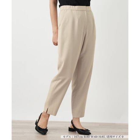 ウエスト回りはゆったり、裾に向かって細くなる絶妙なテーパードシルエットがこなれたムードを演出するパンツ。裾のスリットが足元に軽やかな抜け感をプラスします。後ろウエストはゴム仕様でリラックスした穿き心地ながら、前から見るとすっきり上品な印象に。気になる下半身を自然にカバーしつつ、美しいレッグラインを叶えます。オンオフ問わず活躍し、日々の着こなしを格上げしてくれる一本です。