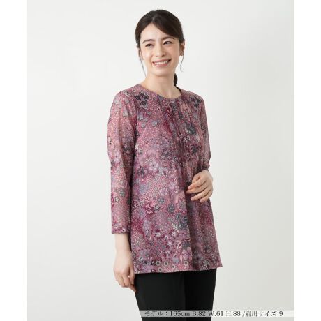 小花柄のプリントが織りなす繊細な世界観と、縦に走るピンタックが奥行きと洗練された雰囲気を叶えるカットソー。薄手の生地は適度な透け感があることで、季節の変わり目に軽やかな着こなしを楽しめます。軽快な印象を保ちつつ伸縮性があるため、ストレスフリーな着心地を実現。ゆったりとしたシルエットで体型を優しくカバーしつつ、着心地も抜群です。デイリーカジュアルにはもちろん、きれいめなパンツやスカートと合わせれば、オフィスシーンやちょっとしたお出かけにも対応します。