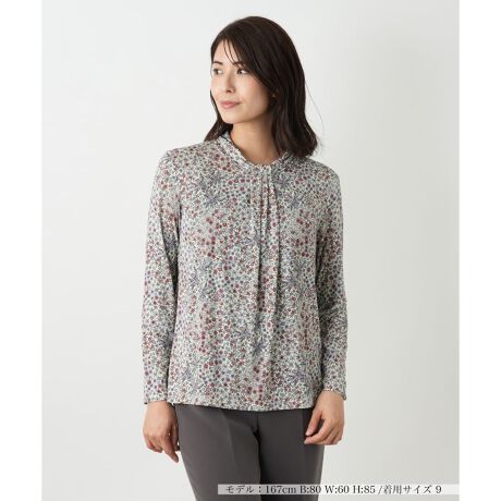秋のコーディネートにクラシカルな華やぎを添える、上品な小花柄のバンドカラーブラウス。胸元にあしらわれたボウタイ風のディテールが、アクセサリー要らずで顔周りを明るく見せてくれます。とろみのある滑らかなレーヨン混ファブリックは、ストレッチが効いていて着心地も抜群。一枚でさらりと着ても、ジャケットやカーディガンのインナーとしても映えるデザインで、オンオフ問わず着回せる主役級のトップスです。