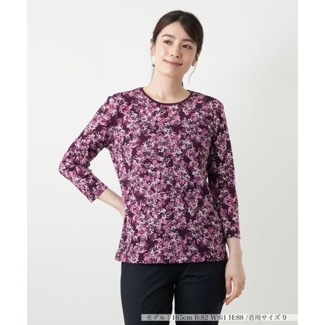 小花柄のモチーフが散りばめられ、一枚で着こなしを華やかに彩るカットソー。薄手で軽やかな生地は程よい抜け感を演出し、涼やかな着心地をキープ。すっきりとしたシルエットでボディラインに優しくフィットし、ストレスフリーな着用感を実現します。クルーネックと七分丈のスリーブは上品な印象を与え、季節の変わり目にぴったりのデザイン。カジュアルなデニムやパンツにはもちろん、きれいめなスカートと合わせれば、大人のフェミニンルックが完成します。