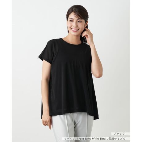 伸縮性に優れたパワーネット素材で仕立てた、ストレスフリーなフレアカットソー。ふわりと広がるAラインのフレアシルエットが、気になる身体のラインを優しくカバーし、動くたびに生まれる美しいドレープが魅力です。肌に張り付かないさらりとした着心地で初秋にかけての季節に最適。ご自宅で手洗いできるので、デイリーに活躍してくれそうです。