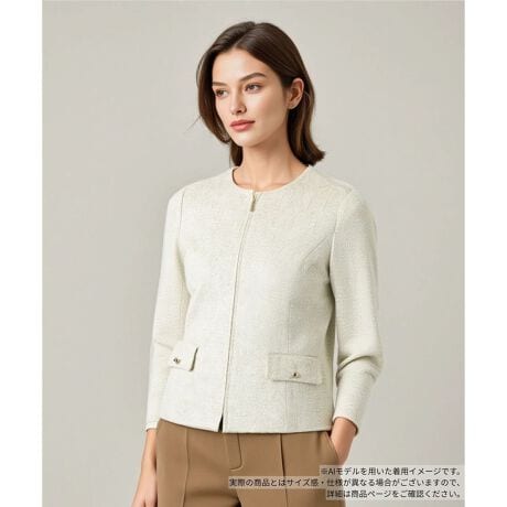 さりげなく織り込まれたラメ糸が、上品な華やかさを演出するノーカラージャケット。フロントはジップ仕様ですっきりと、洗練されたスマートな印象に仕上げました。同素材のボトムスと合わせたセットアップスタイルなら、通勤からオケージョンまで幅広く対応。単品でも着回しの効く、ワードローブにあると重宝する一着です。