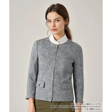 さりげなく織り込まれたラメ糸が、上品な華やかさを演出するノーカラージャケット。フロントはジップ仕様ですっきりと、洗練されたスマートな印象に仕上げました。同素材のボトムスと合わせたセットアップスタイルなら、通勤からオケージョンまで幅広く対応。単品でも着回しの効く、ワードローブにあると重宝する一着です。