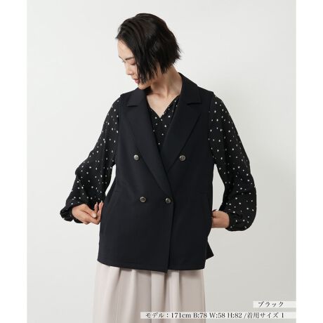 いつものコーデに加えるだけで、知的なムードを演出するダブルブレストのラペルドベスト。クラシカルできちんとした見た目ながら、伸縮性に優れた生地を使用しているため、着心地はストレスフリー。やや長めの着丈と端正なシルエットが縦ラインを強調し、すっきりとした印象に見せてくれます。ブラウスからワンピースまで様々なアイテムに合わせやすく、秋のレイヤードスタイルを格上げしてくれます。