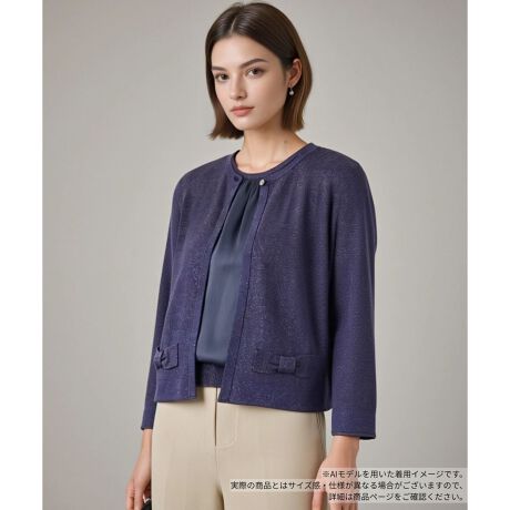 繊細なラメが煌めく大人可愛い、ショート丈のニットカーディガン。前ウエスト部分にあしらった小ぶりなリボンが、フェミニンなアクセントを効かせます。ネック中央にはジュエリーのように煌めくビジューボタンを飾り、顔周りを華やかに演出。伸縮性のある軽やかなやや薄手のニットで、季節の変わり目の羽織りにぴったりです。コーディネートを上品かつ甘いニュアンスに仕上げてくれるアイテムです。