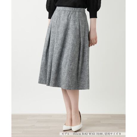 繊細なラメ糸を織り込んだツイードのような表情豊かな生地が、秋の装いを上品に彩るプリーツスカート。フロントにあしらったタックプリーツが美しいAラインシルエットを描き出します。ウエストはゴム仕様できちんと見えと楽な穿き心地を両立。右サイドにはポケットが付いているのも嬉しいポイントです。ブラウスやニットを合わせるだけで、華やかなお出かけスタイルが完成します。サイドホック&ファスナーで開閉が可能。
