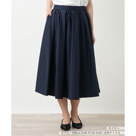 高密度でハリのあるポリエステルタイプライター素材を使用した、タックギャザーフレアスカート。優雅に広がるシルエットが、上品なスタイルを演出します。後ろウエストはゴム入りで快適な履き心地ながら、前ウエストはすっきりとしたデザイン。ご自宅で手洗い可能なウォッシャブル仕様で、日常使いにも最適です。