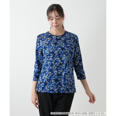 小花柄のモチーフが散りばめられ、一枚で着こなしを華やかに彩るカットソー。薄手で軽やかな生地は程よい抜け感を演出し、涼やかな着心地をキープ。すっきりとしたシルエットでボディラインに優しくフィットし、ストレスフリーな着用感を実現します。クルーネックと七分丈のスリーブは上品な印象を与え、季節の変わり目にぴったりのデザイン。カジュアルなデニムやパンツにはもちろん、きれいめなスカートと合わせれば、大人のフェミニンルックが完成します。