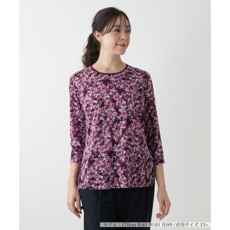 小花柄のモチーフが散りばめられ、一枚で着こなしを華やかに彩るカットソー。薄手で軽やかな生地は程よい抜け感を演出し、涼やかな着心地をキープ。すっきりとしたシルエットでボディラインに優しくフィットし、ストレスフリーな着用感を実現します。クルーネックと七分丈のスリーブは上品な印象を与え、季節の変わり目にぴったりのデザイン。カジュアルなデニムやパンツにはもちろん、きれいめなスカートと合わせれば、大人のフェミニンルックが完成します。