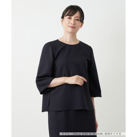 シンプルながらも品のよい佇まいで、オンオフ問わず着回せる七分袖ブラウス。気になる二の腕をカバーしてくれる袖丈と、顔周りをすっきりと見せるクルーネックがクリーンな印象を与えます。伸縮性に優れた素材で動きやすく、快適な着心地を実現しました。同素材のスカートと合わせたセットアップスタイルもおすすめです。