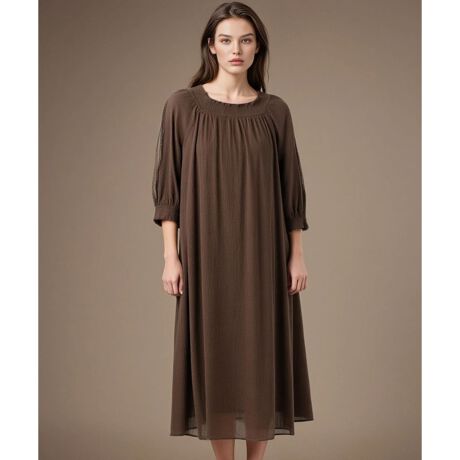 ギャザーが生み出す自然なドレープが、気になる身体のラインをふんわりとカバーしてくれるワンピース。締め付け感のないゆったりとしたシルエットで、リラックスして着用いただけます。襟ぐりと袖口に施されたシャーリングゴムが優しくフィットし、女性らしい柔らかな雰囲気を演出。やや透け感のある軽やかな生地は初秋のスタイリングにぴったり。アンダードレス付きなので、透け感を気にせず着用できるのも安心です。一枚でさらりと着こなすのはもちろん、カーディガンやジャケットを羽織ったり、ベルトでウエストマークしたりと、様々なスタイリングが楽しめます。
