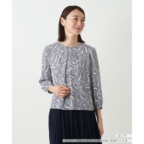 クラシカルな柄が、秋の装いを上品に彩る七分袖ブラウス。胸元に施したタックが美しいドレープを生み、ふんわりとした袖がフェミニンなムードを与えます。袖口はゴム仕様となっており、手元に抜け感を演出する七分袖は季節の変わり目に最適。やや短めの着丈でどんなボトムスともバランスが取りやすく、同素材のスカートと合わせればセットアップとしての着こなしもお楽しみいただけます。背中スナップボタン&ファスナー開閉が可能。