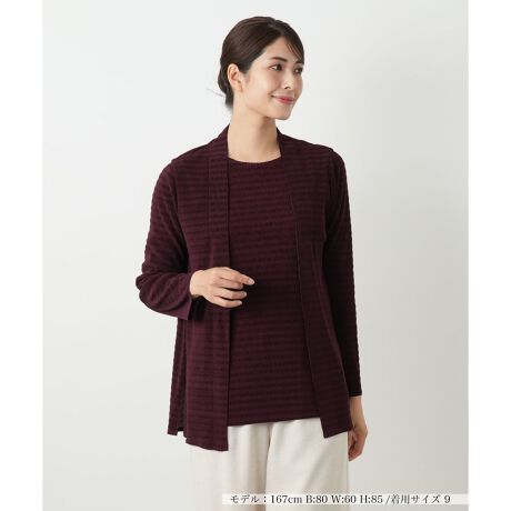 編地の変化でナチュラルなボーダー柄を表現した、表情豊かな生地が魅力の羽織ブラウス。プリントでは出せない、さりげない立体感が着こなしに奥行きを与えます。前留めのないすっきりとしたデザインが縦ラインを強調し、スタイルアップ見せを実現。さっと羽織るだけで、いつものTシャツやワンピーススタイルをぐっと洗練された印象に見せてくれます。冷房対策から秋口のライトアウターまでロングシーズン活躍するアイテム。ご自宅で手洗いできるので、デイリーに気兼ねなくお使いいただけます。