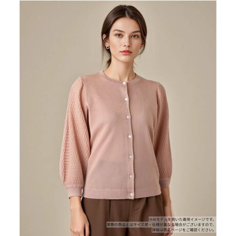 ふんわりとしたバルーンスリーブと、表情豊かな編み地がフェミニンムードを演出するカーディガン。身頃は滑らかな質感のレーヨンポリエステル素材を使用し、上品な佇まいに仕上げました。袖の立体的な編み地とのコントラストがデザイン性を高めるポイント。軽やかな羽織りとしてはもちろん、フロントボタンを留めてプルオーバーのような着こなしも楽しめる、一枚で着映えするトップスです。
