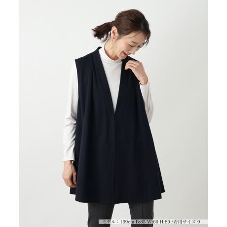 Aラインに美しく広がるシルエットが、ボディラインをナチュラルかつエレガントにカバーしてくれるロング丈のフレアベスト。シャープなVネックが顔周りをすっきりと見せ、全体の印象を引き締めます。いつものコーディネートにさっと羽織るだけで、ワンランク上のこなれたレイヤードスタイルが完成する、これからの季節にぴったりの一枚です。