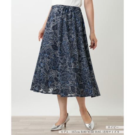 上品な透け感のカットワーク刺繍が、エレガントな雰囲気を醸し出すフレアスカート。繊細な柄がシンプルなトップスに合わせるだけで、着こなしを華やかに引き立てます。ふんわりと広がるフレアシルエットが女性らしさを演出しつつ、気になる腰回りをさりげなくカバー。ウエストは総ゴム仕様でリラックスした穿き心地。ブラウスと合わせてきれいめに、Tシャツと合わせてカジュアルにと幅広いスタイリングが楽しめます。ご自宅で手洗いできるのも嬉しいポイント。