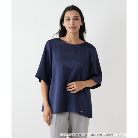 光沢感が特長のストレッチサテン素材に、ワッシャー加工を施し豊かな表情を出したブラウス。ドロップショルダーとゆったりとしたシルエットが、一枚で上品かつリラックス感のある装いを叶えます。半袖のノーカラー丸首デザインで、多様なシーンでお召しいただけます。ご自宅で洗えるウォッシャブル仕様も嬉しいポイントです。