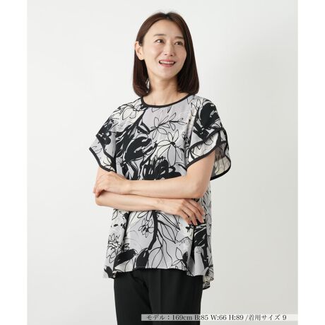まるで一枚の絵画を纏うような、アートなボタニカル柄のプリントブラウス。重なりのあるティアードスリーブがエレガントな雰囲気で、軽やかな薄手の生地も相俟って程よい抜け感を演出。ふんわりとしたスリーブと、身体のラインを拾いにくいシルエットは、気になる部分をさりげなくカバーしながら上品な印象をキープ。残暑が残る日にも心地よく、涼やかな着心地を叶えます。締め付け感がなく、ストレスフリーで快適に着用いただけます。